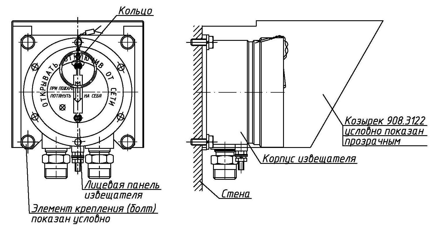 Расположение защищаемых приборов - на стене кабельными вводами вниз или вверх. Для извещателей ExИП535-1В, ExИП535-1В / Г только вниз.