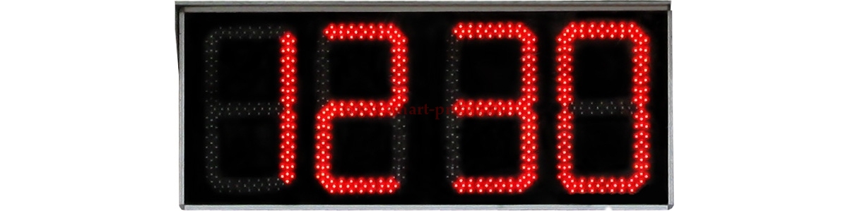Часы оснащены пультом дистанционного управления (ДУ) на ИК-лучах с дальностью срабатывания до 8 метров. Возможно организовать управление от компьютера или первичных часов, которые вы можете разместить в помещении. ЧЦЭ отражают значение текущего времени суток от 00 часов 00 минут до 23 часов 59 минут и дату в формате число-месяц.