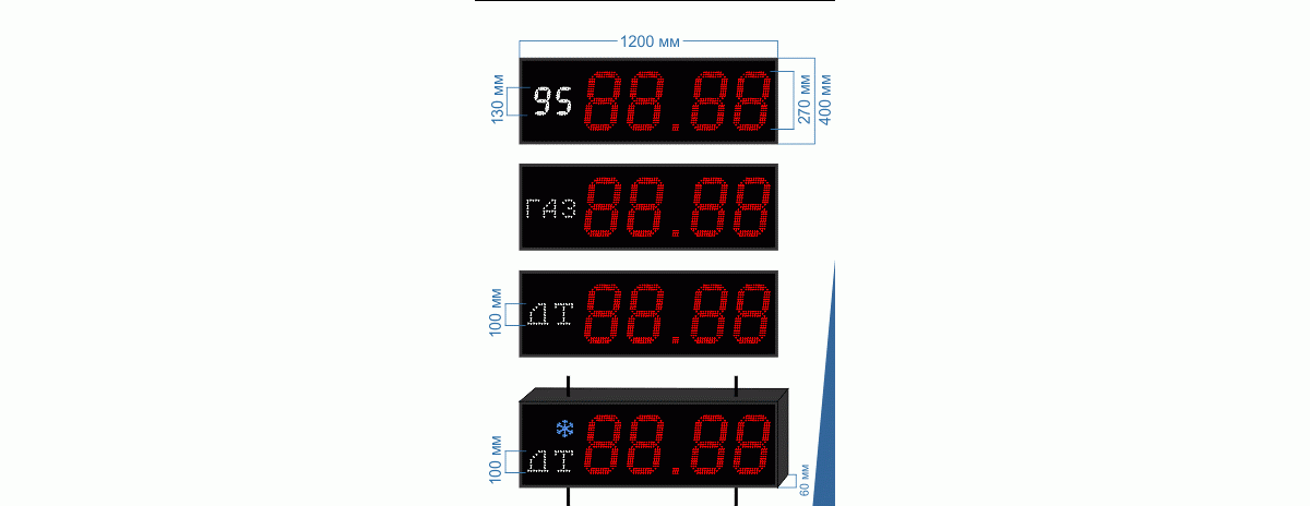 Предназначены для отображения цены и вида топлива, устанавливаются на улице.