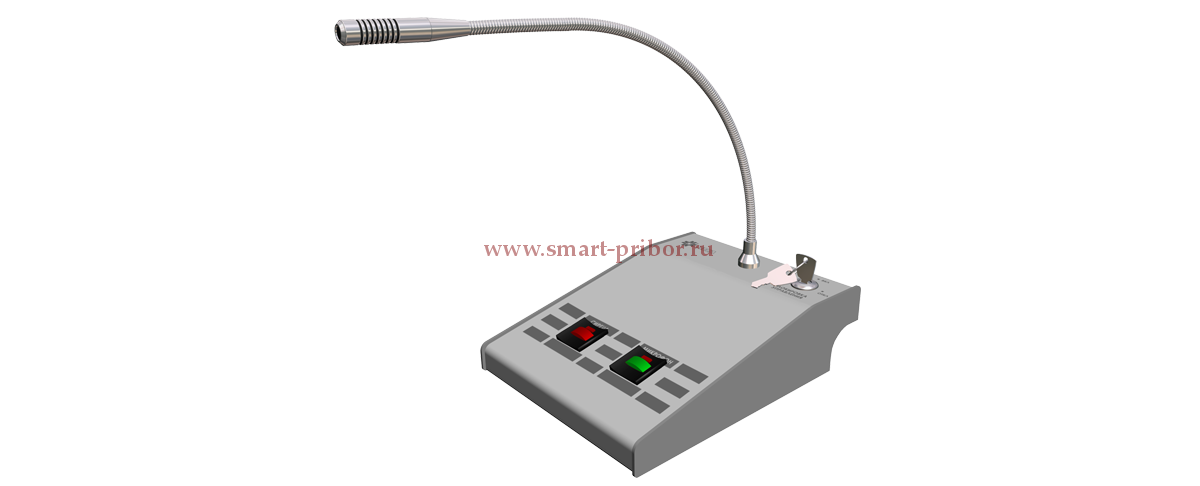 Пульт представляет собой настольное устройство, на панели которого расположены микрофон на гибком держателе типа «гусиная шея», ключ доступа «БЛОКИРОВКА ВКЛ/ВЫКЛ», кнопка «СИРЕНА»и кнопка «МИКРОФОН»со встроенными индикаторами.