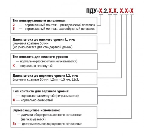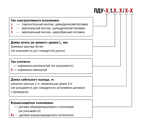 Приведенное условное обозначение указывает, что изготовлению и поставке подлежит поплавковый датчик уровня ПДУ взрывозащищенного исполнения с вертикальным типом монтажа, имеющий один сигнализируемый уровень, цилиндрический поплавок, длину штока 1000 мм, нормально разомкнутым тип контакта и кабельный вывод длиной 3 м.